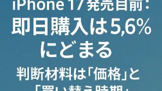 トピックス iPhone 17発売目前:即日購入は5.6%にとどまる—判断材料は「価格」と「買い替え時期」 ヤマネックス株式会社が全国のスマートフォン利用者500名を対象に行った最新調査によると、iPhone 17を「発売日/予約で即購入する」人は5.6%。多くのユーザーは価格や買い替えタイミングを見極めつつ様子見の姿勢でした。 2025.09.12 トピックス