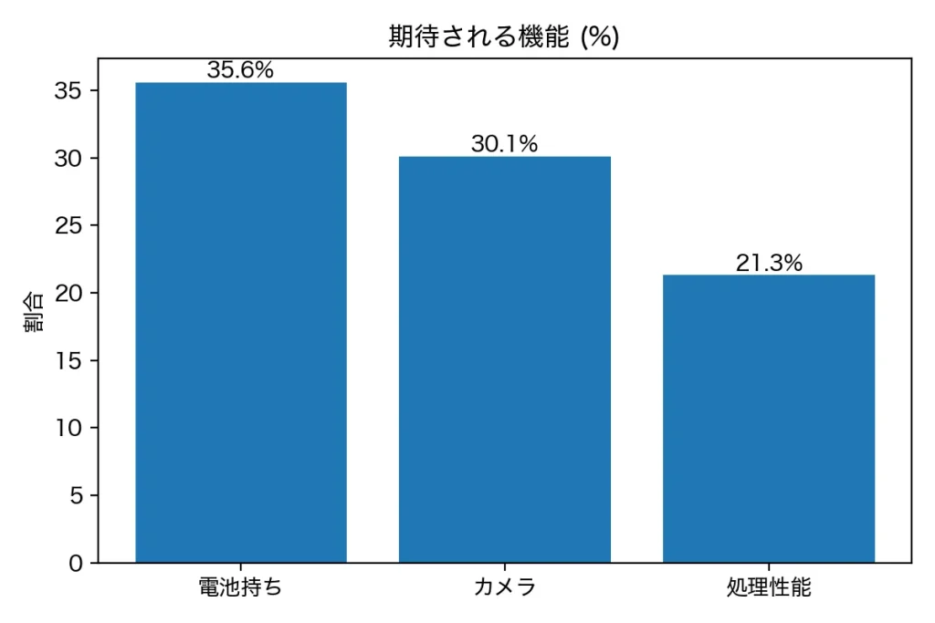 - 期待機能は「電池持ち」「カメラ」「処理性能」が上位。