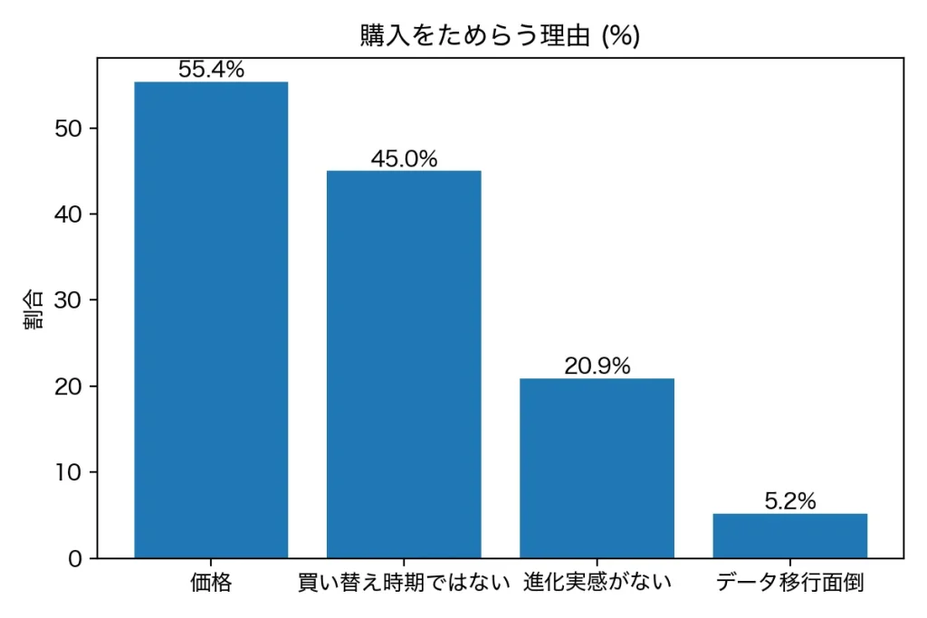 「まだ買い替える時期ではない」45.0%、「必要な進化を感じない」20.9%、「データ移行が面倒」5.2%と続き、コストと価値実感が意思決定を左右していることが分かります。