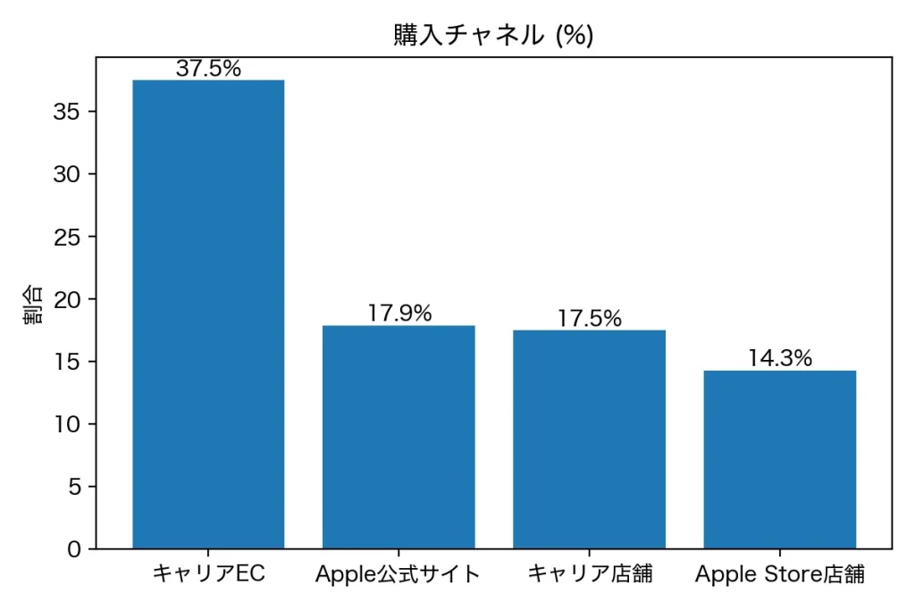 - 購入チャネルはキャリアEC(37.5%)とApple公式サイト(17.9%)が上位で、オンラインが半数超。